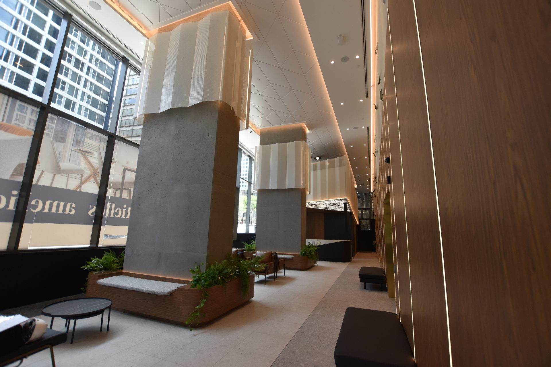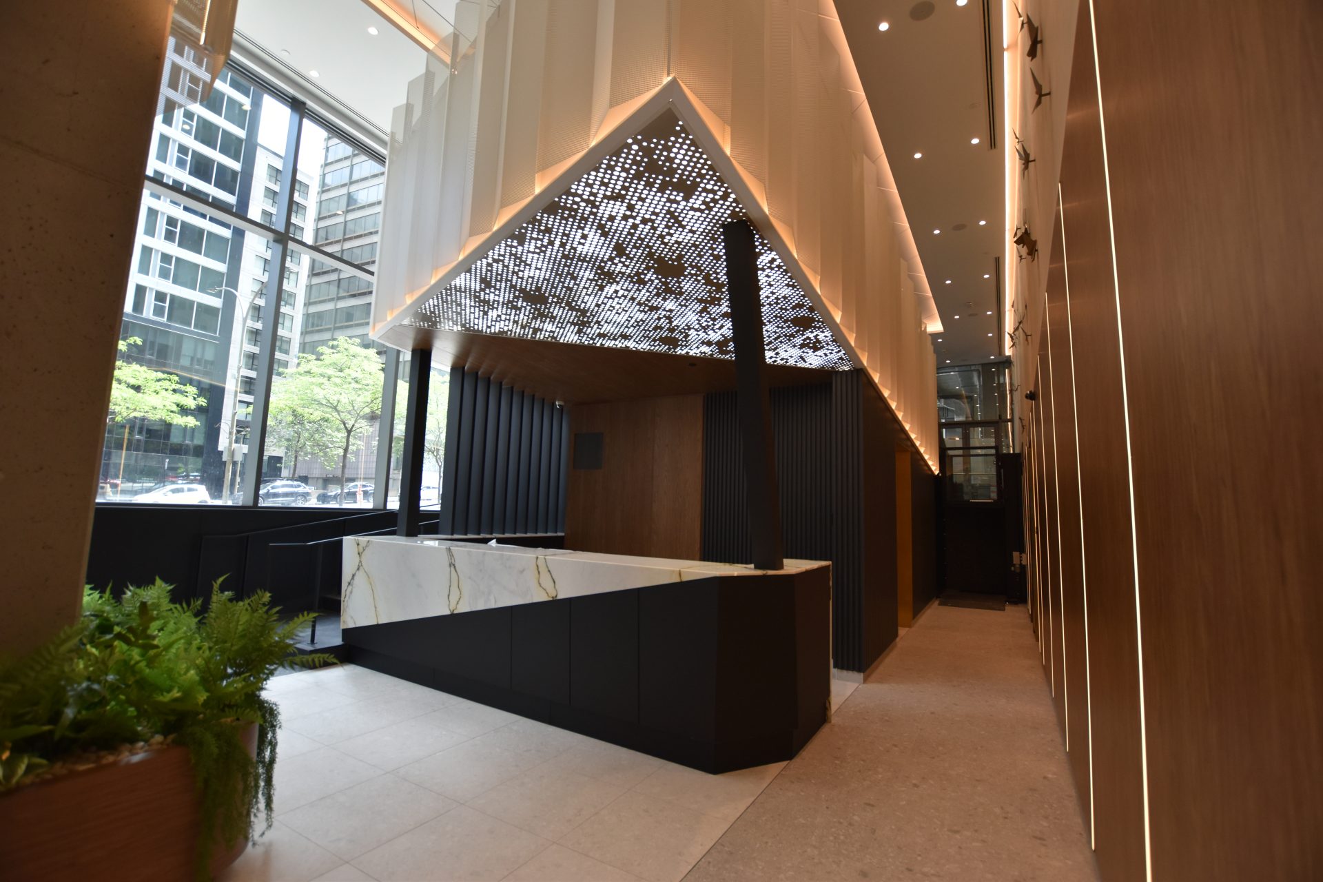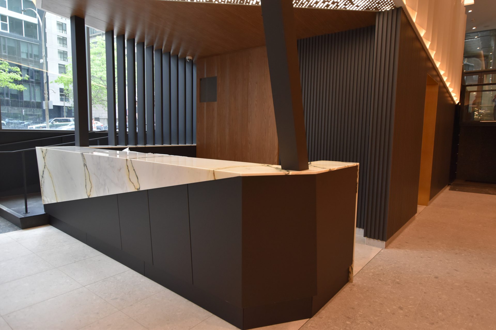 455 René Lévesque - Lobby : bureau de réception, panneaux mur et plafond / Front desk, wood and steel panels, wood ceiling
