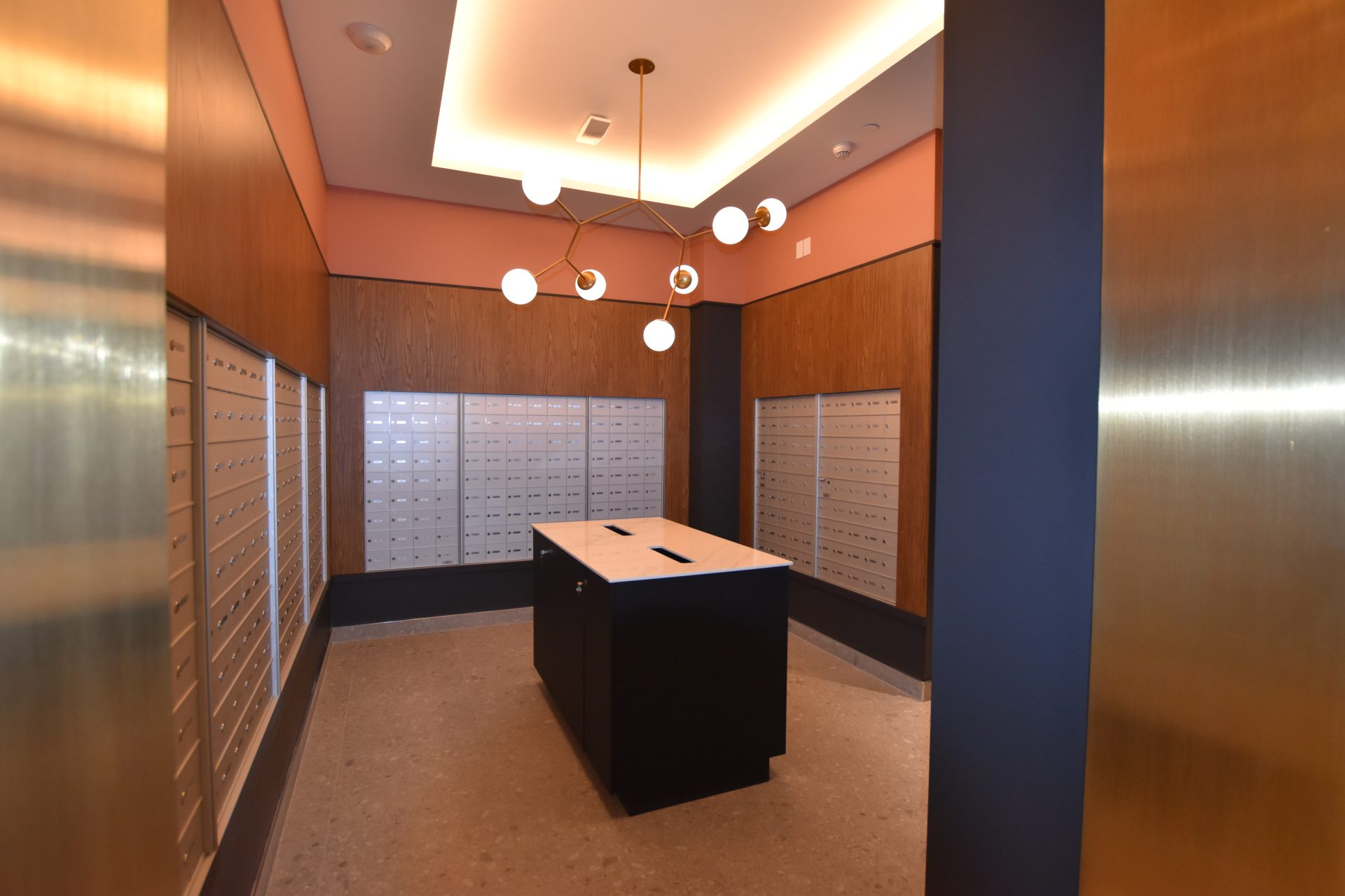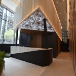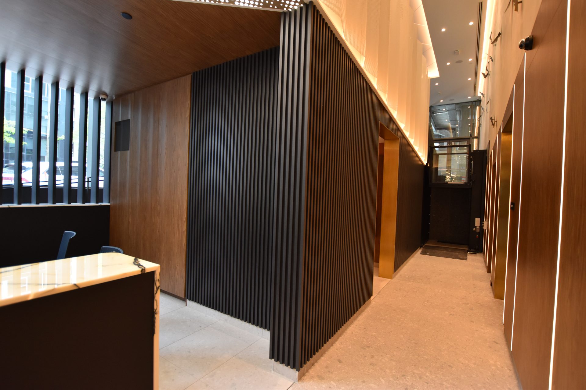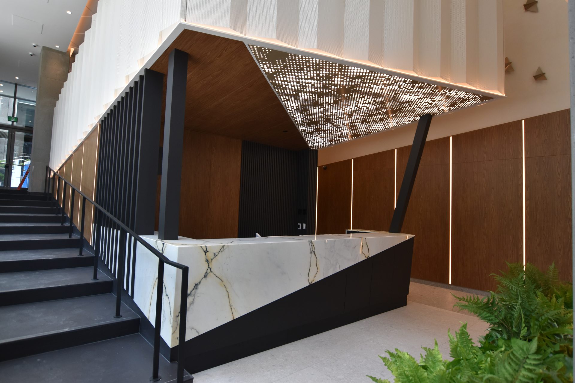 455 René Lévesque - Lobby : bureau de réception, panneaux mur et plafond / Front desk, wood and steel panels, wood ceiling