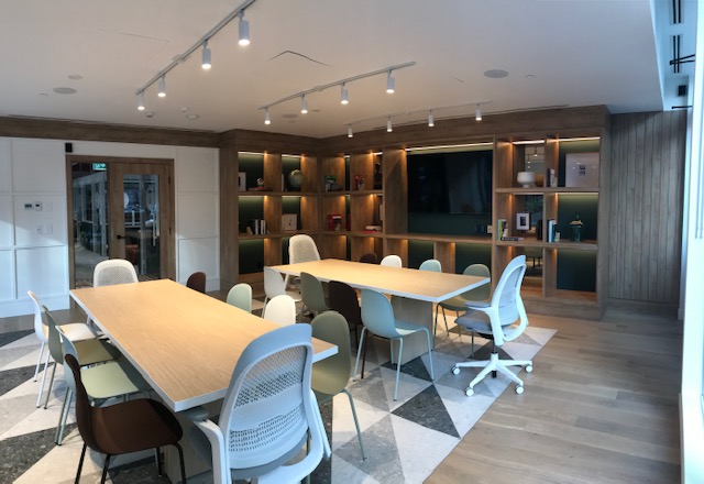 455 René Lévesque - Secret room : banquette, panneaux mur et plafond / banquette, wood ceiling and wall panels, recess ceiling panels.